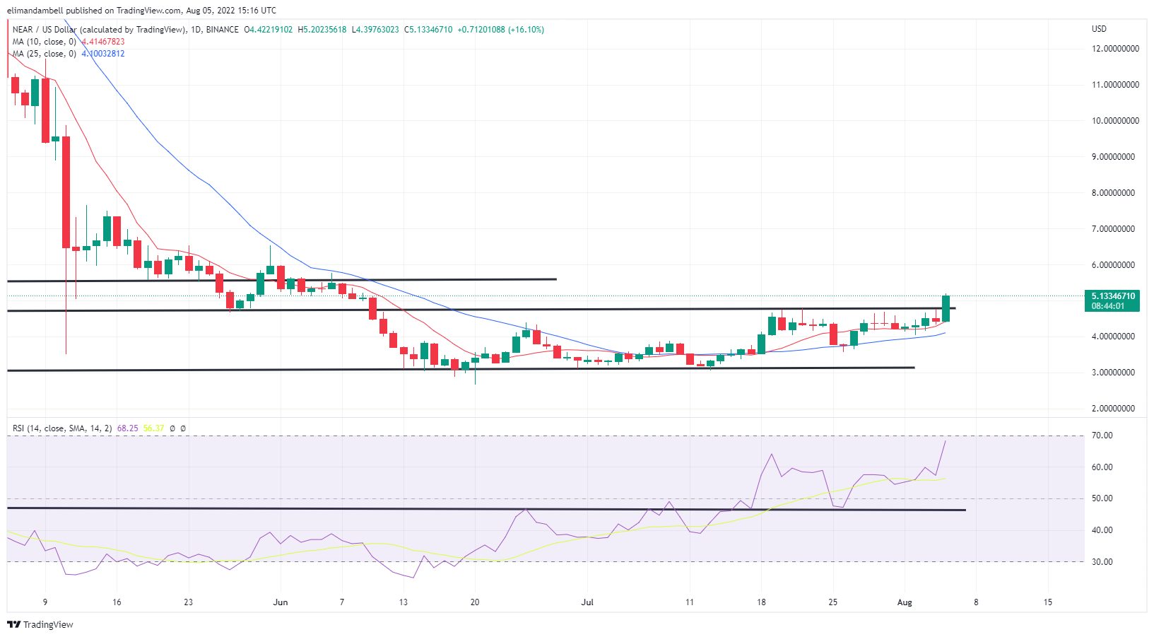 Following a low of $4.33 on Thursday, NEAR/USD raced to a peak of $5.19 earlier in today’s session.